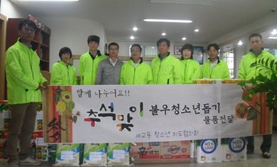 ÆòÅýà ¼¼±³µ¿ û¼Ò³âÁöµµÇùÀÇȸ(ȸÀå Àå½ÂÇõ)´Â Áö³ 12ÀÏ ¼¼±³µ¿Áֹμ¾ÅÍ¿¡¼ 'Ãß¼®¸ÂÀÌ ºÒ¿ìû¼Ò³â µ½±â ¹°Ç° Àü´Þ½Ä'À» °®°í, ½Ò(10kg) 20Æ÷, ¶ó¸é 10¹Ú½º, À½·á 10¹Ú½º, »ýÇÊǰ 10¼¼Æ® µî ¾à 200¸¸ »ó´çÀÇ ¹°Ç°À» ±âŹÇß´Ù.