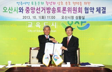 ¿À»ê½Ã(½ÃÀå °û»ó¿í)´Â 1ÀÏ ½Ãû »óȲ½Ç¿¡¼­ ±³À°µµ½Ã À̹ÌÁö¿¡ ºÎÇÕÇÏ´Â ¹ÎÁֽùΠÅä·Ð ¹®È­ È®»ê°ú ¿À»êÀÇ Æ¯È­µÈ Åä·Ð¸ðµ¨À» ±¸ÃàÇϱâ À§ÇØ Áß¾Ó¼±°Å¹æ¼ÛÅä·ÐÀ§¿øÈ¸(À§¿øÀå ÀÌÁ¤Èñ)¿Í »óÈ£ ¿ìÈ£Çù·ÂÀ» À§ÇÑ Çù¾àÀ» ü°áÇß´Ù.
