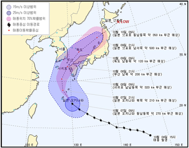 8ÀÏ ¹ã¿¡´Â ºÎ»ê ³²³²µ¿ÂÊ ÇØ»ó(Á߽ɱâ¾Ð 980hPa ³»¿Ü, ÃÖ´ëdz¼Ó 31m/s, È®·ü¿øÁ߽ɿ¡¼­ ¾à 160km °Å¸®)À» Åë°úÇÑ ÈÄ 9ÀÏ »õº®¿¡´Â µ¿ÇØ ³²ºÎ¸Õ¹Ù´Ù·Î ºüÁ® ³ª°¥ °ÍÀ¸·Î Àü¸ÁµÈ´Ù.