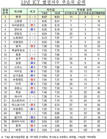 ¿ì¸®³ª¶ó´Â Áö³­ÇØ UN ÀüÀÚÁ¤ºÎ Æò°¡¿Í ¿ÃÇØ ¼¼°èÁöÀûÀç»ê±Ç±â±¸(WIPO)ÀÇ ICT ÀÎÇÁ¶ó Æò°¡¿¡¼­µµ ¼¼°è 1À§¸¦ Â÷ÁöÇѵ¥ À̾î À̹ø ICT ¹ßÀüÁö¼ö¿¡¼­ 4³â ¿¬¼Ó 1À§¸¦ Â÷ÁöÇÔ¿¡ µû¶ó ICT °­±¹ÀÇ À̹ÌÁö¸¦ ±¹Á¦»çȸ¿¡ È®°íÇÏ°Ô ½É¾îÁÖ¾ú´Ù´Â Æò°¡´Ù.