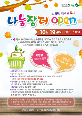 À̹ø Çà»ç´Â °¡Á¤¿¡¼ ¾²Áö ¾Ê´Â Àç»ç¿ëÀÌ °¡´ÉÇÑ ¹°Ç°À» °¡Áö°í ³ª¿Í Á÷Á¢ ±³È¯¡¤ÆÇ¸ÅÇÒ ¼ö ÀÖ´Â ÀåÅÍ·Î, ¿î¾Ï±Ç¿ªÀº ½Ãû ±¤Àå¿¡¼ ¼¼¸¶±Ç¿ªÀº Á×¹ÌüÀ°°ø¿ø¿¡¼ µ¿½Ã ÁøÇàÇÔÀ¸·Î¼ Âü¿©±âȸ¸¦ È®´ëÇßÀ¸¸ç, ¿À»ê½Ã¹Î ´©±¸³ª ´çÀÏ Çà»çÀå¿¡¼ ÇöÀåÁ¢¼ö¸¦ ÅëÇØ Âü¿©ÇÒ ¼ö ÀÖ´Ù.