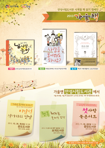 ¾È¼º½Ã¿¡¼´Â '°¡À» Ã¥'À» Áß½ÉÀ¸·Î ù»ç¶û ºÏÄܼƮ, À̳²¼® ÀÛ°¡¿ÍÀÇ ¸¸³², Çàº¹ÇØÁö´Â Ŭ·¡½Ä °¨»ó, û¼Ò³â µ¶¼ Åä·Ðȸ ¹× ½Ã âÀÛȸ, °¡À» µ¶¼¿Õ µî ´Ù¾çÇÑ µ¶¼¹®ÈÇà»ç¸¦ °³ÃÖÇØ ½Ã¹ÎµéÀÇ Âü¿©¸¦ ²ø¾î³¾ °èȹÀÌ´Ù.