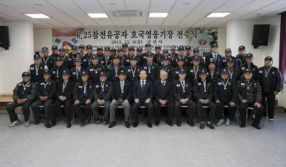 Àü¼ö½ÄÀº ±º»ê½Ã °ÅÁÖ ÂüÀüÀ¯°øÀÚ 821¸í Áß 50¸í¿¡ ´ëÇØ ¹®µ¿½Å ±º»ê½ÃÀåÀÌ ±¹°¡º¸ÈÆÃ³¿¡¼ Á¦ÀÛÇÑ È£±¹¿µ¿õ±âÀåÁõ°ú ¸Þ´ÞÀ» ¼ö¿©ÇÏ¸ç ±×³¯ÀÇ Èñ»ý¿¡ ´ëÇÑ À§·ÎÀÇ ¶æÀ» ÀüÇÏ´Â ÀåÀÌ µÇ¾ú´Ù.