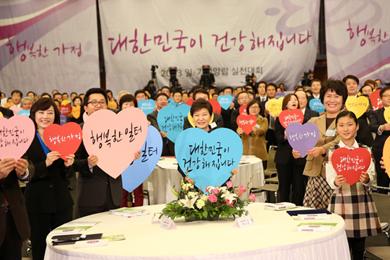 ¹Ú±ÙÇý ´ëÅë·ÉÀÌ 9ÀÏ ¿ÀÈÄ ¼­¿ï Áß±¸ ³²´ë¹®·Î4°¡ ´ëÇÑ»ó°øÈ¸ÀǼҿ¡¼­ ¿­¸° ¡®ÀÏ¡¤°¡Á¤ ¾ç¸³ ½Çõ´ëȸ¡¯¿¡¼­ ÇÏÆ® ¸ð¾çÀÇ ÆÖ¸»À» µé°í ¡®ÇູÇÑ °¡Á¤, ÇູÇÑ ÀÏÅÍ, ´ëÇѹα¹ÀÌ °Ç°­ÇØÁý´Ï´Ù¡¯¸¦ ¿ÜÄ¡°í ÀÖ´Ù.(»çÁø=û¿Í´ë)