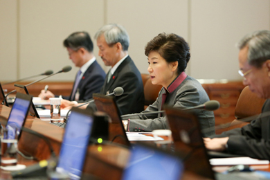 ¹Ú±ÙÇý ´ëÅë·ÉÀÌ 23ÀÏ Ã»¿Í´ë¿¡¼­ ¿­¸° ´ëÅë·É ÁÖÀç ¼ö¼®ºñ¼­°üȸÀÇ¿¡¼­ ¸ðµÎ¹ß¾ðÀ» Çϰí ÀÖ´Ù. (»çÁø=û¿Í´ë)