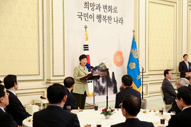 ¹Ú ´ëÅë·ÉÀº À̳¯ û¿Í´ë¿¡¼­ 5ºÎ ¿äÀΰú Â÷°ü±Þ ÀÌ»ó Á¤ºÎ °íÀ§°øÁ÷ÀÚ, ¿©¡¤¾ß ´ëÇ¥, °æÁ¦ 5´ÜüÀå µî 230¿© ¸íÀÌ Âü¼®ÇÑ °¡¿îµ¥ ¿­¸° ½Å³âÀλçȸ¿¡¼­ À̰°ÀÌ ¹àÇû´Ù.