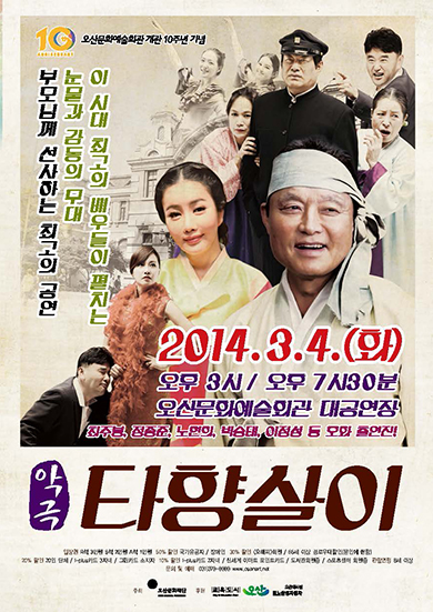 ¿À»ê¹®È­¿¹¼úȸ°ü ´ë °ø¿¬Àå¿¡¼­ ¿À´Â 3¿ù 4ÀÏ(È­) 3½Ã¿Í 7½Ã30ºÐ ÃÑ 2ȸ¿¡ °ÉÃÄ ÆîÃÄÁú <ŸÇâ»ìÀÌ>´Â °ÅÄ£ ¼¼¿ùÀ» »ì¾Æ¿À½Å ¾î¸£½ÅµéÀÇ Çâ¼ö¿Í ´«¹°»ùÀ» ÀÚ±ØÇÏ¸ç °ü°´µé¿¡°Ô °¨µ¿À» ¼±»çÇÒ ¸íǰ ¾Ç±Ø °ø¿¬ÀÌ´Ù.