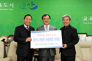 À̳¯ Áý¹«½Ç¿¡¼­ ¿­¸° ¼ö¿µ¿ëǰ ±âŹ½Ä¿¡´Â °û»ó¿í ¿À»ê½ÃÀå, °­À±¼® È­¼º¿À»ê±³À°Áö¿øÃ» ±³À°Àå, °øÃ¢¹è ¿À»ê½Ã ¼ö¿µ¿¬¸Í ȸÀåÀ» ºñ·ÔÇÑ °ü°èÀÚ°¡ Âü¼®ÇÑ °¡¿îµ¥ ¿À»ê½Ã ¼ö¿µ¿¬¸Í¿¡¼­ Àú¼ÒµæÃþ Çлý 179¸í¿¡°Ô ½Ë°¡ 2,700¸¸¿ø »ó´çÀÇ ¼ö¿µ¿ëǰÀ» Àü´ÞÇß´Ù.
