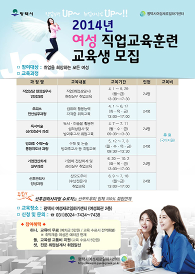 ÆòÅýà ¿©¼º»õ·ÎÀÏÇϱ⼾ÅÍ¿¡¼­´Â °æ·Â´ÜÀý ¿©¼ºµéÀÇ Á÷¾÷´É·Â ¹× Ãë¾÷ÀڽۨÀ» Çâ»óÇϰí Ãë¾÷À¸·ÎÀÇ ¼º°øÀ» À§ÇÑ¡¸2014³âµµ ¿©¼º Á÷¾÷±³À°ÈÆ·Ã ÇÁ·Î±×·¥¡¹6°³ °úÁ¤À» ¿À´Â 4¿ù 1ÀÏ(È­)À» ½ÃÀÛÀ¸·Î 6°³¿ù°£ ¼øÂ÷ÀûÀ¸·Î ¿î¿µÇÑ´Ù°í ¹àÇû´Ù.