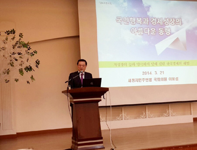 ÀÌ ÀÇ¿øÀº ¡°Çѱ¹°æÁ¦´Â ÇöÀç 1Àδç GDP 2¸¸ ´Þ·¯ÀÌ»ó, ¹«¿ª 1Á¶ ´Þ·¯¿¡ ´ÞÇÏ´Â ¼¼°è 7À§ÀÇ °æÁ¦´ë±¹À¸·Î ¼ºÀåÇßÁö¸¸ ´Ù¾çÇÑ ºÎÀÛ¿ëÀÌ ³ªÅ¸³ª°í ÀÖ´Ù¡±¸ç ¡°ÀÌ´Â »õ Á¤ºÎ°¡ ³°Àº Á¤Ã¥±âÁ¶¿Í »ê¾÷»çȸ¶§³ª À¯È¿Çß´ø ½ÅÀÚÀ¯ÁÖÀÇ Á¤Ã¥À» °í¼öÇ߱⠶§¹®À̸ç ÀÌ·Î ÀÎÇØ Çѱ¹ ÇູÁö¼ö ¼øÀ§ Ç϶ô, °¢Á¾ °æÁ¦ÁöÇ¥ Ãß¶ô, ±í¾îÁö´Â »çȸ¾ç±ØÈ­, °í¿ëÈ¿°ú °¨¼Ò µî Çѱ¹°æÁ¦°¡ Àú¼ºÀå ´Ë¿¡ ºüÁö°í ÀÖ´Ù¡±°í ÁöÀûÇß´Ù.