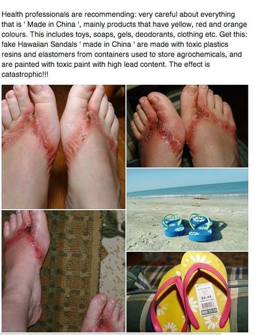 ¹ø¿ª: ÀÇ·áÀü¹®°¡µéÀº Áß±¹¿¡¼­ Á¦Á¶µÈ ¸ðµç Á¦Ç°, ÁÖ·Î ³ë¶õ»ö°ú »¡°£ »ö ±×¸®°í ¿À·»Áö»ö±òÀÌ µé¾î°£Á¦Ç°µé¿¡ ´ëÇØ Á¶½ÉÇÒ °ÍÀ» °­·ÂÇÏ°Ô ±Ç°íÇß´Ù. Àå³­°¨µé, ºñ´©, Á©, µð¿Àµµ·±Ã÷(¹æÃëÁ¦), ÀÇ·ù µîÀÌ Æ÷ÇԵȴÙ. ¡°Áß±¹»ê¡± ¦Åü ÇÏ¿ÍÀÌ¾È »÷´ÞµéÀº ³ó¾àÀ» ÀúÀåÇϱâ À§ÇØ »ç¿ëµÇ¾ú´ø º¸°üÇÔµé°ú °°Àº À¯ÇØÇÃ¶ó½ºÆ½ ¼öÁöµé°ú ÇÕ¼º°í¹«µé·Î ¸¸µé¾îÁ³°í °í³óµµÀÇ ³³¼ººÐÀ» ÇÔÀ¯ÇÑ À¯ÇØÆäÀÎÆ®·Î µµ»öµÇ¾î ÀÖ´Ù. ÀÌ·¯ÇÑ Á¦Ç°À» »ç¿ëÇÑ °á°ú´Â ÂüȤÇÒ Á¤µµÀÌ´Ù.