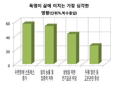 Æø¿°ÀÌ »î¿¡ ¹ÌÄ¡´Â °¡Àå ½É°¢ÇÑ ¿µÇâ(º¹¼öÀÀ´ä)À¸·Î´Â ¡®¼ö¸éÀå¾Ö¡¤½ºÆ®·¹½º Áõ°¡¡¯(57.1%), ¡®ÀÏÀÇ ´É·ü ¹× ÁýÁß·Â ÀúÇÏ¡¯(54.0%), ¡®³Ã¹æÀ» À§ÇÑ Àü±â¿ä±Ý ºÎ´ã¡¯(42.6%), ¡®µÎÅë, Å»Áø µî °í¿Â°ü·Ã Áõ»ó¡¯(26.2%) ¼øÀ̾ú´Ù. ¼ºº°·Î´Â ¿©¼ºÀÌ ¡®¼ö¸éÀå¾Ö¡¤½ºÆ®·¹½º Áõ°¡¡¯(54.9%)¸¦, ³²¼ºÀº ¡®ÀÏÀÇ ´É·ü ¹× ÁýÁß·Â ÀúÇÏ¡¯(60.8%)¸¦ ¿ì¼±À¸·Î ²Å¾Ò´Ù.