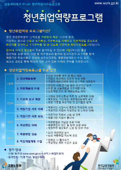 ¿Ã ÇϹݱâºÎÅÍ Ã»³â±¸Á÷ÀÚ°¡ °í¿ë³ëµ¿ºÎ °í¿ë¼¾ÅÍ¿¡ °¡¸é ÀÚ½ÅÀÇ ¿ª·®À» º¸´Ù È¿°úÀûÀ¸·Î ±â¾÷¿¡¼ÇÒ ¼ö ÀÖ´Â Ãë¾÷±â¼úÀ» ü°èÀûÀ¸·Î ¾Ë·ÁÁÖ´Â ¡®Ã»³âÃë¾÷¿ª·® ÇÁ·Î±×·¥¡¯À» µéÀ» ¼ö ÀÖ°Ô µÆ´Ù.