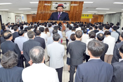 Á¤·Ê Á¶È¸¸¦ ¸¶Ä£ ¹Ú ½ÃÀåÀº Âü¼®ÇÑ Á÷¿øµé°ú ÀÏÀÏÀÌ ¾Ç¼öÇϸç ù ¸¸³²ÀÇ ÀÚ¸®¸¦ ¸¶¹«¸®Çß´Ù.