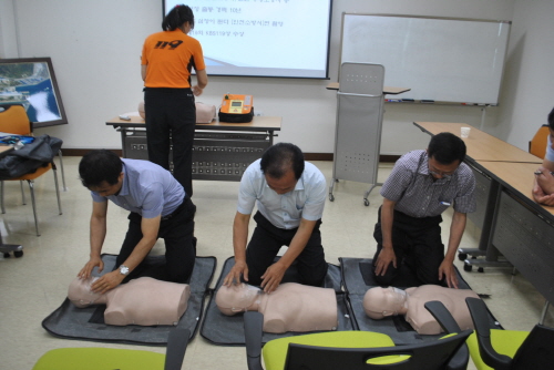 °ÀÇ Âü¼®ÀÚµéÀº ÁßºÎ¼Ò¹æ¼ ±è¹Î¿µ ¼Ò¹æ°üÀÇ Áöµµ¿¡ µû¶ó »ç¶÷ ¸ðÇüÀ» µÎ°í ÀÚµ¿Á¦¼¼µ¿±â(AED) ½ÅÈ£¿¡ ¸ÂÃç ½ÉÆó¼Ò»ý¼ú(CPR)À» Á÷Á¢ ÇØº¸±âµµ Çß´Ù.