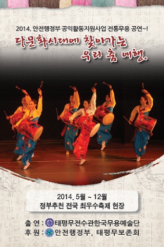 ¾È¼º½Ã ÅÂÆò¹«Àü¼ö°üÇѱ¹¹«¿ë¿¹¼ú´Ü, ¡®´Ù¹®È½Ã´ë¿¡ ã¾Æ°¡´Â ¿ì¸® Ãã ¿©Ç࡯ - 2014 ¾ÈÀüÇàÁ¤ºÎ°¡ Áö¿øÇÏ´Â °øÀÍȰµ¿Áö¿ø»ç¾÷ Áß ÀüÅ빮ȿ¹¼úºÐ¾ß·Î ¼±Á¤ |