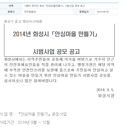 ¡®¾È½É¸¶À» ¸¸µé±â¡¯»ç¾÷Àº ȼº½Ã°¡ ¡®»ç¶÷ÀÌ ¸ÕÀúÀΠȼº¡¯±¸ÇöÀ» À§ÇØ ½Ã¹ÎÀÌ Á÷Á¢ Âü¿©Çϰí ÇàÁ¤±â°üÀº ÇØ´ç Áö¿ª¿¡ ºÎÁ·ÇÑ ¾ÈÀü ÀÎÇÁ¶ó¸¦ º¸¿ÏÇØ ÁÖ´Â »ç¾÷À¸·Î 3ÀÎ ÀÌ»óÀ¸·Î ±¸¼ºµÈ ÁֹΠ¶Ç´Â Áö¿ª ´Üü°¡ ¹üÁË․Àç³․Àç¹è µî °¢Á¾ ¾ÈÀü»ç°í ¿¹¹æÀ» À§ÇÑ ¾ÈÀüÇÁ·Î±×·¥À» ÀÚüÀûÀ¸·Î ±¸¼ºÇØ ½ÅûÇÏ¸é µÈ´Ù.