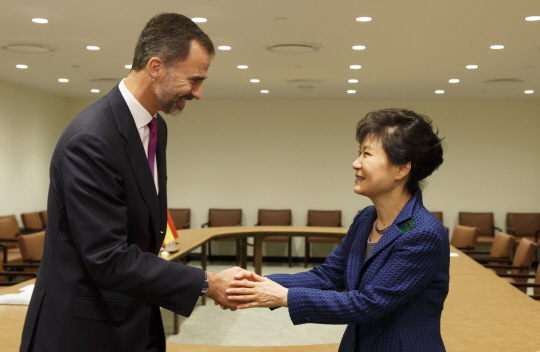 Á¦69ȸ À¯¿£ ÃÑȸ¿¡ Âü¼®ÁßÀÎ ¹Ú±ÙÇý ´ëÅë·ÉÀº 23ÀÏ Æç¸®Æä 6¼¼(Felipe VI) ½ºÆäÀÎ ±¹¿Õ°ú ȸ´ãÀ» °®°í, Á¦3±¹ ½ÃÀå °øµ¿ ÁøÃâ Çù·Â, ½ÅÀç»ý¿¡³ÊÁö, °ü±¤, Ç×°ø, ¹®È ºÐ¾ß µî¿¡¼ÀÇ È£ÇýÀû ½ÇÁúÇù·Â ÁõÁø, Çѹݵµ ¹× µ¿ºÏ¾Æ Á¤¼¼ Æò°¡, ±¹Á¦ Á¤¼¼ µî¿¡ ´ëÇØ ½Éµµ ÀÖ´Â ÀǰßÀ» ±³È¯Çß´ÙÆç¸®Æä 6¼¼ ±¹¿ÕÀº ´çÃÊ 9¿ù Çѱ¹À» ¹æ¹®ÇÏ·Á°í ÇÏ¿´À¸³ª, ±¹¿ÕÀÇ ¾çÀ§¿¡ µû¸¥ ÁïÀ§ µîÀÇ »çÁ¤À¸·Î ¹æÇÑÇÏÁö ¸øÇÏ¿´´Âµ¥ ÀÌÇØÇØ ÁÖ½Ç °ÍÀ¸·Î »ý°¢ÇÑ´Ù°í Çϸé¼, ¹æÇÑ ºÎºÐÀº ÁüÀ» ¾È°Ô µÇ¾úÀ¸³ª ¹Ú ´ëÅë·ÉÀÇ ½ºÆäÀÎ ¹æ¹®À» ¿äûÇÑ´Ù°í ¹àÇû´Ù.