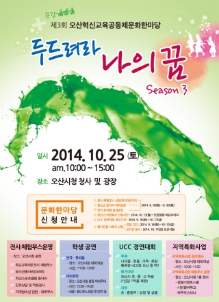 ¡°µÎµå·Á¶ó ³ªÀÇ ²Þ Season3¡± 2014³â Á¦3ȸ ¿À»êÇõ½Å±³À°°øµ¿Ã¼ ¹®ÈÇѸ¶´çÀÌ °æ±âµµÈ¼º¿À»ê±³À°Áö¿øÃ»(±³À°Àå °À±¼®)°ú ¿À»ê½Ãû(½ÃÀå °û»ó¿í)ÀÇ ÁÖÃÖ·Î 10¿ù 25ÀÏ(Åä) 9½Ã 30ºÐºÎÅÍ 3½Ã±îÁö ¿À»ê½Ãû ±¤Àå¿¡¼ Áñ°Ì°í dz¼ºÇÑ, ³ª´®¡¤°ø°¨ÀÇ ÃàÁ¦ÀÇ ÀåÀ» ÆîÄ¥ ¿¹Á¤ÀÌ´Ù.