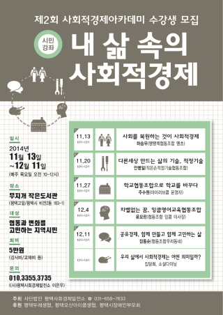 Á¦2ȸ »çȸÀû °æÁ¦ ¾ÆÄ«µ¥¹Ì¿¡¼´Â »ýȰ ¼ÓÀÇ ´Ù¾çÇÑ »çȸÀû °æÁ¦ »ç·Ê, Çùµ¿Á¶ÇÕÀÇ ´Ù¾ç¼º ¸ð»ö, Ȱ¼ºÈ ¹æ¾È µî¿¡ ´ëÇÑ ±³À°À¸·Î ÁøÇàµÇ¸ç, ÆòÅõη¹»ýÇù, ÆòÅÿÀ»ê¾ÆÀÌÄò»ýÇù, ÆòÅýÃÀå¾ÖÀκθðȸÀÇ ÈÄ¿øÀ¸·Î 11¿ù 13ÀϺÎÅÍ ¿À´Â 12¿ù 11ÀϱîÁö 5ÁÖ°£(¸ÅÁÖ ¸ñ¿äÀÏ ¿ÀÀü 10½Ã~12½Ã)¿¡ °ÉÃÄ ¹«Áö°³ ÀÛÀºµµ¼°ü(ÆòÅðí¾Õ)¿¡¼ ¿¸°´Ù.