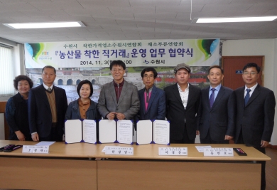 ¼ö¿ø½Ã(½ÃÀå ¿°Å¿µ)¿Í ÂøÇѰ¡°Ý¾÷¼Ò¼ö¿ø½Ã¿¬ÇÕȸ(ȸÀå ¿À±¤ÀÚ), ä¼ÒºÎ·ù¿¬ÇÕȸ(ȸÀå ÇÑõ¿ì)´Â 3ÀÏ ¼ö¿ø³ó¼ö»ê¹°µµ¸Å½ÃÀå°ü¸®»ç¹«¼Ò 2Ãþ ȸÀǽǿ¡¼ ¡®³ó»ê¹° ÂøÇÑ Á÷°Å·¡¡¯¿î¿µ Çù¾à½ÄÀ» °¡Á³´Ù.