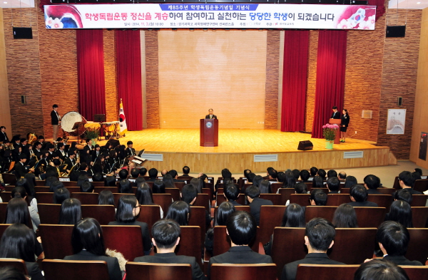 ÀÌÀçÁ¤ °æ±âµµ±³À°°¨Àº Àλ縻À» ÅëÇØ ¡°¿À´ÃÀº ¹ÎÁ·ÀÇ ÀÚÁÖµ¶¸³°ú Á¤ÀÇ·Î¿î ¿ª»ç¸¦ À§ÇØ, ±×¸®°í Àΰ£À¸·Î¼ °¡Ä¡ ÀÖ´Â »îÀ» »ì¾Ò´ø ÇлýµéÀÇ ¼þ°íÇÑ Á¤½ÅÀ» »õ±â´Â ³¯ÀÌ´Ù ¿©·¯ºÐÀº °æ±âµµ, ³ª¾Æ°¡ ´ëÇѹα¹ÀÇ Èñ¸ÁÀÌ°í ¹Ì·¡´Ù. ÀÚÀ¯¿Í Á¤ÀǸ¦ Áö۱â À§ÇØ ½Å¸íÀ» ¹ÙÃÆ´ø ¼±¹èµéÀÇ ÀDZⰡ ¿©·¯ºÐÀÇ ÇÍÁÙ¿¡ È帣°í ÀÖÀ½À» ÀØÁö ¸»±æ¡° ´çºÎÇß´Ù.