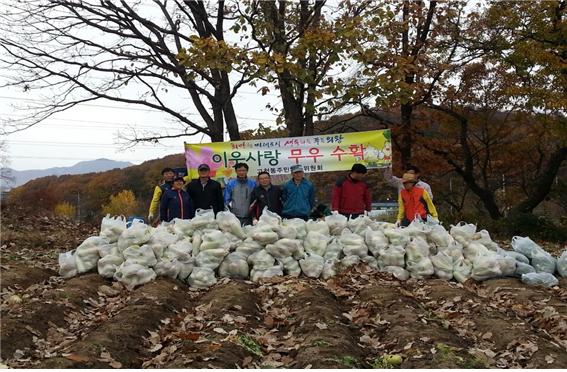 °íõµ¿ ÁÖ¹ÎÀÚÄ¡À§¿øµéÀº Áö³­ 4°³¿ù°£ ÁÖ¸»³óÀåÀ» ÀÌ¿ë, Á¤¼º½º·´°Ô ¹«¸¦Àç¹èÇÏ¿© 300kg »ó´çÀÇ ¹«¸¦ ¼öÈ®ÇÏ¿´À¸¸ç °íõµ¿ Áֹμ¾Å͸¦ ÅëÇØ Áö¿ªÀÇ ±âÃÊ»ýȰ¼ö±ÞÀÚ ¹× µ¶°Å³ëÀε鿡°Ô Àü´ÞÇß´Ù.