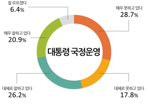 ¿©·ÐÁ¶»ç Àü¹®±â°ü ¸ð³ë¸®¼­Ä¡´Â Áö³­ 17~18ÀÏ Àü±¹ ¼ºÀγ²³à 1,000¸íÀ» ´ë»óÀ¸·Î Á¤·Ê ´ëÅë·É ±¹Á¤¿î¿µ Æò°¡ Á¶»ç¸¦ ½Ç½ÃÇß´Ù. ¡®ÀßÇÔ¡¯ÀÌ 47.1%(´ëü·Î ÀßÇÔ 26.2%, ¸Å¿ì ÀßÇÔ 20.9%), ¡®À߸øÇÔ¡¯ÀÌ 46.5%(¸Å¿ì ¸øÇÔ 28.7%, ´ëü·Î ¸øÇÔ 17.8%)ÀÇ ÀÀ´ä·üÀÌ ³ª¿Ô´Ù. ¡®Àß ¸ð¸§¡¯Àº 6.4%¿´´Ù.