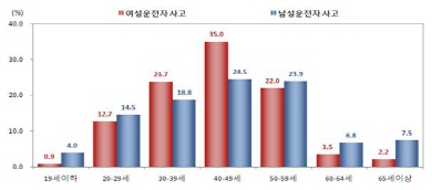 ÃÖ±Ù 5³â°£(2009~2013³â) ¹ß»ýÇÑ ¿©¼º¿îÀüÀÚ ±³Åë»ç°í(185,984°Ç)¸¦ ºÐ¼®ÇÏ¿© º¸¸é, ¿¬·ÉÃþº°·Î´Â 40´ë ¿©¼º¿îÀüÀÚ »ç°í(35.0%)°¡ ³²¼º¿îÀüÀÚ »ç°í(24.5%)¿¡ ºñÇØ »ó´ëÀûÀ¸·Î ¸¹ÀÌ ¹ß»ýÇÑ °ÍÀ¸·Î ³ªÅ¸³µ´Ù.