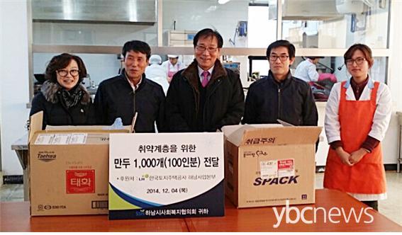 Áö³ 4ÀÏ LHÇѱ¹ÅäÁöÁÖÅðø»ç Çϳ²»ç¾÷º»ºÎÀÇ ÀÌ»ó°ï º»ºÎÀå°ú Á÷¿øµéÀÌ ÁÖº¯ÀÇ ¾î·Á¿î ÀÌ¿ôÀ» À§ÇØ ¸¸µé¾ú´Ù¸ç ¸¸µÎ 1,000°³(100ÀκÐ)¸¦ Á÷Á¢ ºú¾î Çϳ²½Ã»çȸº¹ÁöÇùÀÇȸ(ȸÀå ¼ÃἺ) ºÎ¼³ Çϳ²½ÃǪµå¹ðÅ©¿¡ Àü´ÞÇß´Ù.