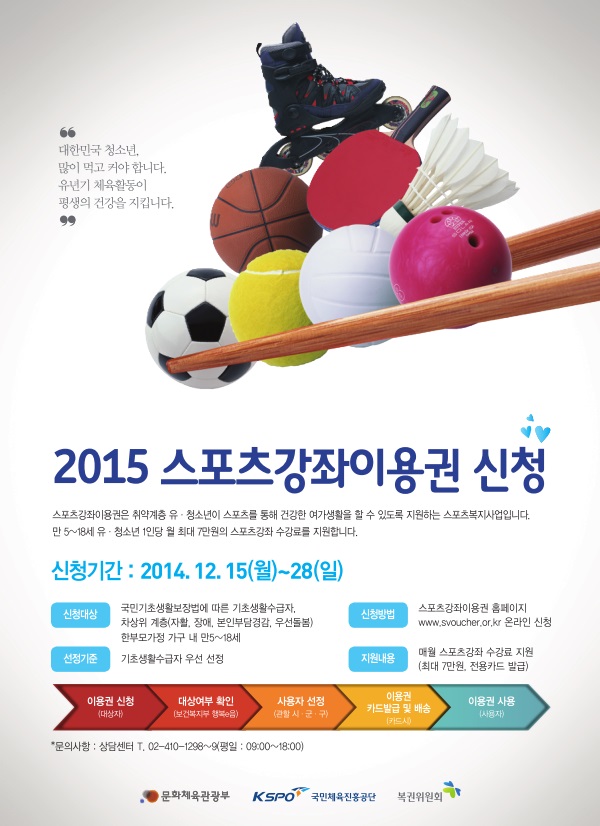 2015³â ½ºÆ÷Ã÷°­ÁÂÀÌ¿ë±Ç »ç¾÷½ÅûÀÌ ¿À´Â 15ÀϺÎÅÍ 28±îÁö ±¹¹ÎüÀ°ÁøÈï°ø´Ü ½ºÆ÷Ã÷°­ÁÂÀÌ¿ë±Ç ȨÆäÀÌÁö (www.svoucher.or.kr)¿¡¼­ ¼ö°­½ÅûÀ» ½ÃÀÛÇÑ´Ù.