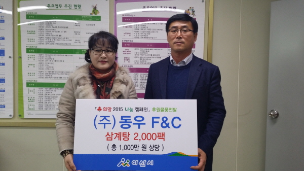 ¾Æ»ê½Ã ¿°Ä¡À¾¿¡ ¼ÒÀçÇÑ ¢ßµ¿¿ìF&C(´ëÇ¥ À±¿øÁÖ)°¡ Áö¿ª º¹Áö Çâ»óÀ» À§ÇØ Áö³ 10ÀÏ ¾Æ»ê½Ã ±³À°º¹Áö±¹Àå½ÇÀ» ¹æ¹®ÇØ ÈÄ¿ø¹°Ç°À» Àü´ÞÇß´Ù.