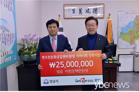 Çѱ¹¸¶»çȸ ·¿Ã÷·±¹®È­°ø°¨¼¾ÅÍ ºÐ´ç(Çѱ¹¸¶»çȸµ¿ºÎ±Ç¿ªº»ºÎÀå ÃÖ¿øÀÏ)´Â »ýȰÀÌ ¾î·Á¿î ¼¼´ë¸¦ À§ÇØ ½á ´Þ¶ó¸ç 12¿ù 18ÀÏ ¼º³²½Ã¿¡ ÀåÇÐ ¼º±Ý 2,500¸¸¿øÀ» ³Â´Ù.