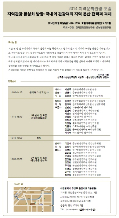 Ãæ³²¹ßÀü¿¬±¸¿ø(¿øÀå °­Çö¼ö, ÀÌÇÏ Ãæ¹ß¿¬)Àº Çѱ¹¹®È­°ü±¤¿¬±¸¿ø(¿øÀå ¹Ú±¤¹«, ÀÌÇÏ ¹®È­°ü±¤¿¬)°ú °øµ¿À¸·Î Áö¿ª°ü±¤ Ȱ¼ºÈ­ ¹æÇâÀ» ¸ð»öÇϱâ À§ÇÑ ¡®2014 Áö¿ª¹®È­°ü±¤ Æ÷·³¡¯À» 19ÀÏ ¿ÀÈÄ2½Ã ´ëÀü ¸®º£¶óÈ£ÅÚ¿¡¼­ °³ÃÖÇÑ´Ù°í ¹àÇû´Ù.