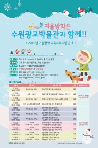 ¼ö¿ø ±¤±³¹Ú¹°°üÀº °Ü¿ï¹æÇÐÀ» ¸Â¾Æ ³»³â 1¿ù 14ÀϺÎÅÍ 24ÀϱîÁö À¯¾Æ ¹× ÃʵîÇлýÀ» ´ë»óÀ¸·Î °Ü¿ï¹æÇÐ ±³À° ÇÁ·Î±×·¥À» ¿î¿µÇÑ´Ù.