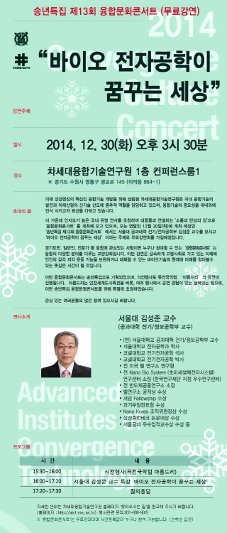 ƯÈ÷, À̹ø Äܼ­Æ®´Â 2014³âÀ» ¸¶°¨ÇÏ´Â ¼Û³âƯÁýÀ¸·Î Ç»Àü±¹¾ÇÆÀÀÇ ÃÊû°ø¿¬ÀÌ ÇÔ²² ÀÖÀ» ¿¹Á¤ÀÌ´Ù. À̳¯ °­¿¬¿¡´Â ¼­¿ï´ë ±è¼ºÁØ ±³¼ö(Àü±âÁ¤º¸°øÇкÎ)°¡ ¿¬»ç·Î ÃÊûµÇ¾î ¡®¹ÙÀÌ¿À ÀüÀÚ°øÇÐÀÌ ²Þ²Ù´Â ¼¼»ó¡¯À̶ó´Â ÁÖÁ¦·Î °­¿¬ÇÑ´Ù.