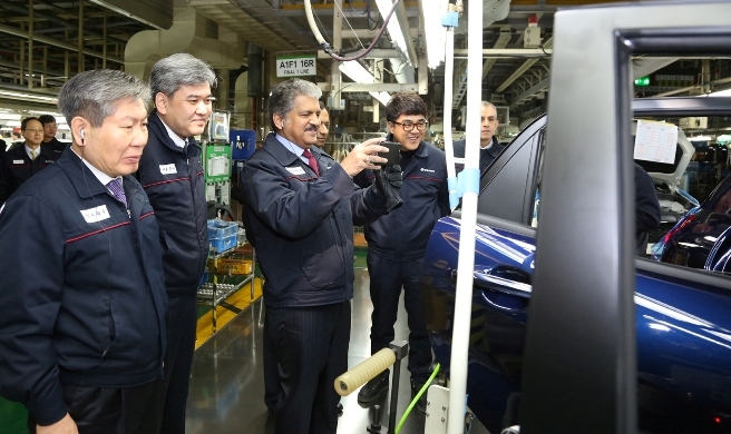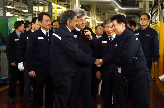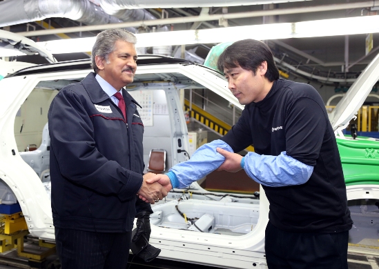 À̳¯ ¿ÀÀü ÆòÅðøÀåÀ» ¹æ¹®ÇÑ ¸¶Èùµå¶ó ȸÀå°ú ÀÌÀ¯ÀÏ ´ëÇ¥À̻縦 ºñ·ÔÇÑ ¸¶Èùµå¶ó&¸¶Èùµå¶ó(M&M) ¹× ½Ö¿ëÀÚµ¿Â÷ ÀÓ¿øÁøÀº ¡®Æ¼º¼¸®¡¯ ¸¦ »ý»êÇÏ´Â Á¶¸³ 1¶óÀÎÀº ¹°·Ð ¡®ÄÚ¶õµµ Åõ¸®½º¸ð¡¯ ¹× ¡®ÄÚ¶õµµ ½ºÆ÷Ã÷¡¯ °¡ »ý»êµÇ´Â Á¶¸³ 2, 3¶óÀÎ µî ÆòÅðøÀå Àü »ý»ê¶óÀΰú ÇÔ²² R&D ¼¾Å͸¦ Á÷Á¢ µ¹¸ç Â÷·® »ý»êÀ» À§ÇØ ±¸½½¶¡À» È긮´Â Á÷¿øµéÀÇ ³ë°í¸¦ Ä¡ÇÏÇß´Ù.