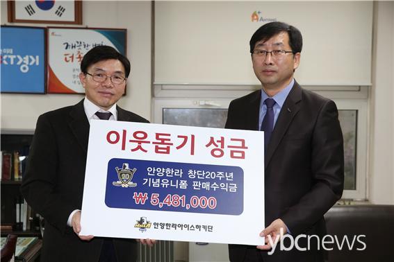 ÀÛ³â 12¿ù¿¡ ¾ÆÀ̽ºÇÏŰ ¼±¼ö 26¸íÀÌ °æ±â¿¡ ÀÔ°í ¶Ù¾ú´ø À¯´ÏÆûÀ» ÃÖ°í ÀÔÂû¾× ¹æ½ÄÀ¸·Î ÀÏ¹Ý ½Ã¹Îµé¿¡°Ô °æ¸ÅÈÄ ¸ð±ÝµÈ ¼öÀÍ±Ý 5,481õ¿øÀ» 1¿ù 14ÀÏ ¾È¾ç½ÃûÀ» ¹æ¹® ±âºÎÇÏ°í ¾È¾çÁö¿ª »çȸº¹Áö´Üü ¹× ¼Ò¿Ü°èÃþÀ» À§ÇØ »ç¿ëÇØ ´Þ¶ó°í ¸»Çß´Ù.