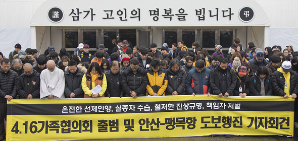 4¡¤16°¡Á·ÇùÀÇȸ´Â À̳¯ ¿ÀÀü 9½Ã30ºÐ µµº¸ ÇàÁøÀ» ¶°³ª±â Àü ±âÀÚȸ°ßÀ» ¿¾î ¼¼¿ùÈ£ ¼±Ã¼ Àξç°ú Áø»ó±Ô¸íÀ» À§ÇÑ Á¤ºÎÀÇ Àû±ØÀûÀÎ ³ë·ÂÀ» Ã˱¸Çß´Ù. À̵éÀº "Áö³ÇØ 11¿ù ¼ö»ö Á¾°á ÈÄ ¿ÂÀüÇÑ ¼±Ã¼ ÀξçÀ» ¹Ï¾ú´Âµ¥, ÀÌÁ¦¿Í ½Ã°£À» ²ø°í ÀξçÀ» ¹Ý´ëÇÏ·Á´Â ¿òÁ÷ÀÓÀ» º¸ÀÌ´Â Á¤ºÎ ¿©´ç°ú ±¹°¡±â°üÀÇ Åµµ¿¡ °¡¸¸È÷ ÀÖÀ» ¼ö ¾ø¾ú´Ù"°í ÁÖÀåÇß´Ù.