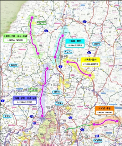 À̳¯ ¼±¾ð¿¡ µû¶ó °¢ ±â°üÀº ¿ì¼± ½Ã±ÞÇÑ °ø»ç±¸°£ÀÎ ¾çÁÖ °¡³³~»ó¼ö(5.7km, ¡¯15³â Âø°ø), ÆÄÁÖ ¼³¸¶~±¸À¾(8km, °øÁ¤ 59%), ¿¬Ãµ Àû¼º~µÎÀÏ(6.3km, ¡¯15³â Âø°ø), ±¤¾Ï~¸¶»ê(11.3km, °øÁ¤ 46%) 4°³ »ç¾÷À» 2018³â±îÁö ÁذøÇϱâ·Î ÇÕÀÇÇß´Ù.