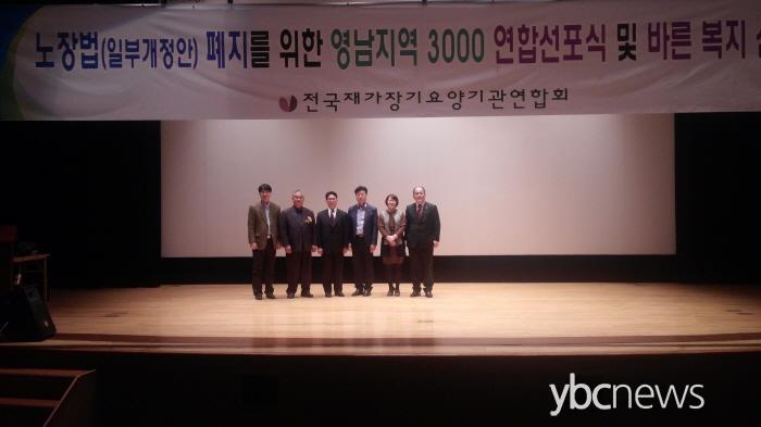 Àü±¹ Àç°¡ Àå±â¿ä¾ç±â°ü ¿¬ÇÕȸ ȸ¿øµéÀº ¡°ÀÌ·¯ÇÑ ¿ÜħÀ» ¿Ü¸éÇÏ°í °³Á¤ ¹ý¾ÈÀÌ Åë°úµÉ ½Ã ¿ì¸® ¹Î°£Àå±â ¿ä¾ç±â°ü ¿î¿µÀÚ Àϵ¿Àº ´ëÇѹα¹¹ýÀÌ Çã¿ëÇÏ´Â ¹üÀ§¿¡¼ ¸ðµç ¼ö´Ü°ú ¹æ¹ýÀ» µ¿¿øÇÏ¿© ¹ýÀÇ ½ÇÇàÀ» ÀúÁöÇÒ °ÍÀÌ´Ù¡± ¸»ÇßÀ¸¸ç ¾ÕÀ¸·Îµµ À̵éÀº ±Ç¸®¸¦ ãÀ» ¶§±îÁö ±È±â ´ëȸ ¹× ¼±¾ð½ÄÀ» Áö¼ÓÀûÀ¸·Î ÇÒ °èȹÀ̶ó°í ¹àÇû´Ù.