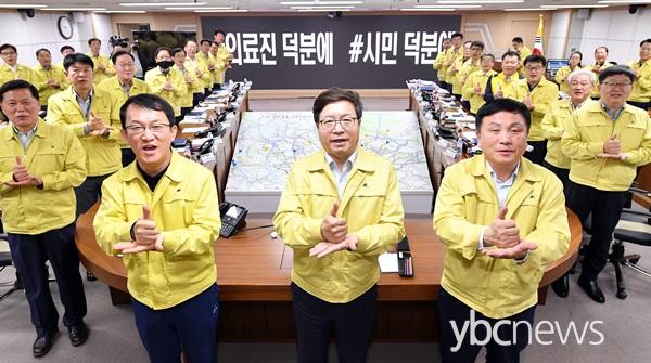 ¿°Å¿µ ½ÃÀåÀº ¾Æ¿ï·¯ ¡°°øÁ÷ÀÚ, ÀÇ·áÀÎ µî Äڷγª19 ¹æ¿ª ÃÖÀϼ±¿¡¼ ¾Ö¾²½Ã´Â ¸ðµç ºÐ, ºÒÆíÀ» °¨¼öÇÏ°í ¡®»çȸÀû °Å¸®µÎ±â¡¯¸¦ ½ÇÃµÇØÁֽô ½Ã¹Î ¿©·¯ºÐ²² Áø½ÉÀ¸·Î °¨»çµå¸°´Ù¡±°í ¸»Çß´Ù.