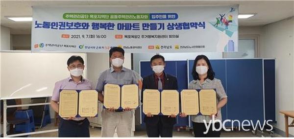 ¸ñÆ÷¿Á¾Ï2 ÀÓÂ÷ÀδëǥȸÀÇ(ȸÀå Á¤±¤³²)°ú Àü³²³ëµ¿±ÇÀͼ¾ÅÍ, Àü³²¼ºÎ ±Ù·ÎÀڰǰ¼¾Åʹ°øµ¿ÁÖÅÃÀ» °ü¸®ÇÏ´Â ³ëµ¿ÀÚµéÀÇ ³ëµ¿ÀαÇÀ» º¸È£ÇÏ°í °Ç°ÇÑ ¾ÆÆÄÆ®°øµ¿Ã¼¸¦ ¸¸µé±â À§ÇÑ ÇູÇÑ ¾ÆÆÄÆ®¸¸µé±â »ó»ýÇù¾à½ÄÀ» °®¾ú´Ù.