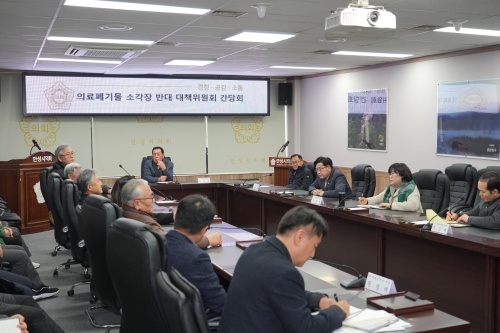 ¾È¼º½ÃÀÇȸ(ÀÇÀå ¾ÈÁ¤¿)°¡ 20ÀÏ ¼ÒÅëȸÀǽǿ¡¼ ÀÇ·áÆó±â¹° ¼Ò°¢Àå ¹Ý´ë ´ëÃ¥À§¿øÈ¸(À§¿øÀå ¾È¿ì»ó)¿Í °£´ãȸ¸¦ °¡Á³´Ù.