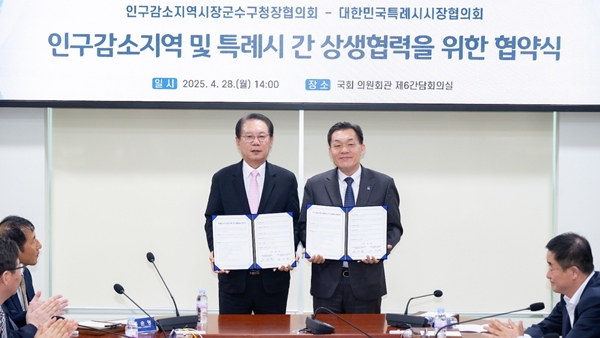 ´ëÇѹα¹Æ¯·Ê½Ã½ÃÀåÇùÀÇȸ(´ëǥȸÀå ÀÌÀçÁØ ¼ö¿ø½ÃÀå)¿Í Àα¸°¨¼ÒÁö¿ª½ÃÀ塤±º¼ö¡¤±¸Ã»ÀåÇùÀÇȸ(´ëǥȸÀå ¼ÛÀÎÇå ±«»ê±º¼ö)´Â 28ÀÏ ±¹È¸ ÀÇ¿øÈ¸°ü¿¡¼ »ó»ýÇù·Â Çù¾àÀ» ü°áÇϰí, Çù·ÂÀ» ¾à¼ÓÇß´Ù. ÀÌÀçÁØ ¼ö¿ø½ÃÀå, ¼ÛÀÎÇå ±«»ê±º¼ö°¡ Çù¾à¼¿¡ ¼¸íÇß´Ù. Çù¾à½Ä¿¡´Â ±¹È¸ ÇàÁ¤¾ÈÀüÀ§¿øÀå ½ÅÁ¤ÈÆ ÀÇ¿ø, ¿°Å¿µ(¼ö¿ø½Ã¹«), Àα¸°¨¼ÒÁö¿ª ÀÇ¿ø µîÀÌ Âü¼®Çß´Ù.