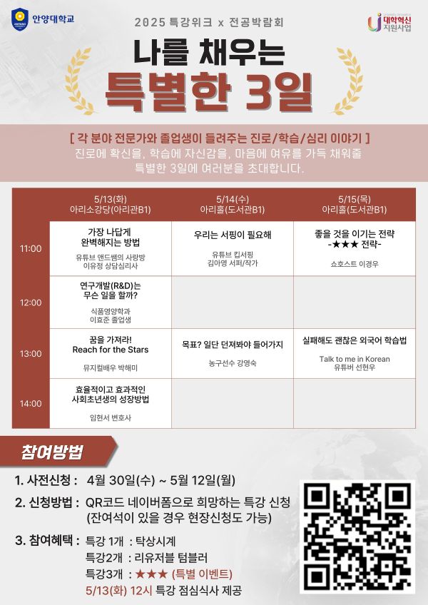 ¾È¾ç´ëÇб³(ÃÑÀå À層¼ö) ±³À°¿ª·®°­È­¼¾ÅÍ(¼¾ÅÍÀå ÀÌÀ±Áø)´Â ÇнÀ, Áø·Î, ½É¸® °ü·Ã Àü¹®°¡ ÃÊû ¸±·¹ÀÌ Æ¯°­ÀÎ ¡®Æ¯°­ À§Å©¡¯¸¦ 13ÀϺÎÅÍ 15ÀϱîÁö »çÈê°£ °³ÃÖÇϰí ÀÖ´Ù.