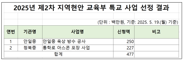 À̹ø ±³À°ºÎ Ư±³´Â ¡ã¾ÈÀÏÁß ¿Á»ó¹æ¼ö °ø»ç»ç¾÷ 2¾ï 5,000¸¸ ¿ø, ¡ãûºÏÁß ÅëÇзΠ¾Æ½ºÄÜ Æ÷Àå »ç¾÷ 2¾ï 2,700¸¸ ¿ø µî ÃÑ 4¾ï 7,700¸¸ ¿ø »ó´çÀÇ ±Ô¸ð´Ù.