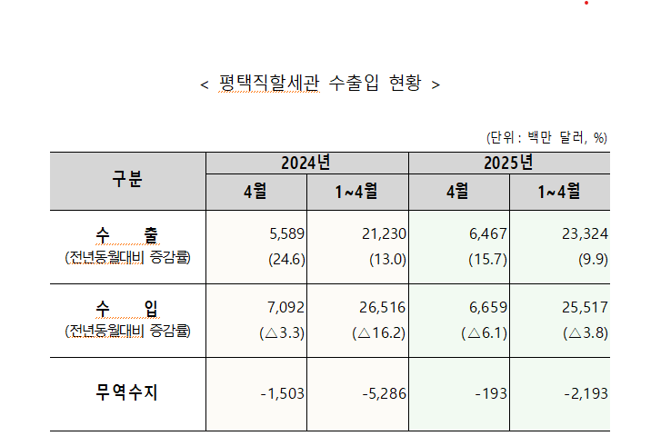 4¿ù ÆòÅü¼°ü ¼öÃâÀÔ ÇöȲÀ» Áý°èÇÑ °á°ú, ¼öÃâ¾×Àº 15.7% Áõ°¡ÇÑ 64¾ï 7õ¸¸ ´Þ·¯, ¼öÀÔ¾×Àº 6.1% °¨¼ÒÇÑ 66¾ï 6õ¸¸ ´Þ·¯¸¦ ±â·ÏÇß´Ù.