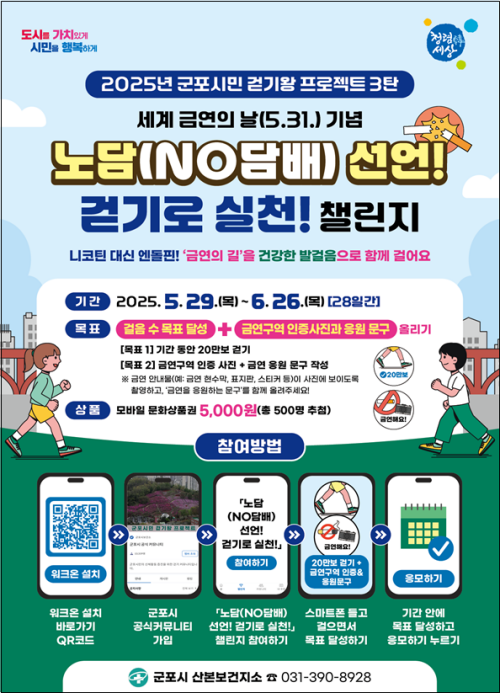 ±ºÆ÷½Ã »êº»º¸°ÇÁö¼Ò´Â Á¦38ȸ ¼¼°è ±Ý¿¬ÀÇ ³¯(5¿ù 31ÀÏ)À» ±â³äÇÏ¿©, Áö¿ª ÁÖ¹ÎÀÇ °Ç°­»ýȰ ½ÇõÀ» Àå·ÁÇÏ°í ±Ý¿¬ ȯ°æ¿¡ ´ëÇÑ ÀÎ½Ä Á¦°í¸¦ À§ÇØ ¸ð¹ÙÀÏ °È±â ¾Û ¡®¿öÅ©¿Â(WalkOn)¡¯À» Ȱ¿ëÇÑ °È±â 縰Áö¸¦ ¿î¿µÇÑ´Ù.