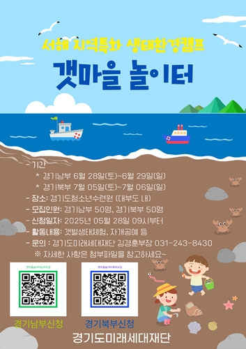 ÇØ¾ç »ýÅÂŽ¹æ, ¹Ù´Ù »ý¹° °üÂû, ÀÚ°³ °ø¿¹ µî Áö¿ªÆ¯È »ýÅÂÀÚ¿øÀ» Ȱ¿ëÇÑ ÇÁ·Î±×·¥Àº °æ±â ³²ºÎ¿Í ºÏºÎ ÃÑ 2°³ ±Ç¿ªÀ¸·Î ³ª´² ÁøÇàµÈ´Ù. ³²ºÎ û¼Ò³â ´ë»ó 1Â÷ Ä·ÇÁ´Â 6¿ù 28~29ÀÏ, ºÏºÎ û¼Ò³â 2Â÷ Ä·ÇÁ´Â 7¿ù 5~6ÀÏÀÌ´Ù.
